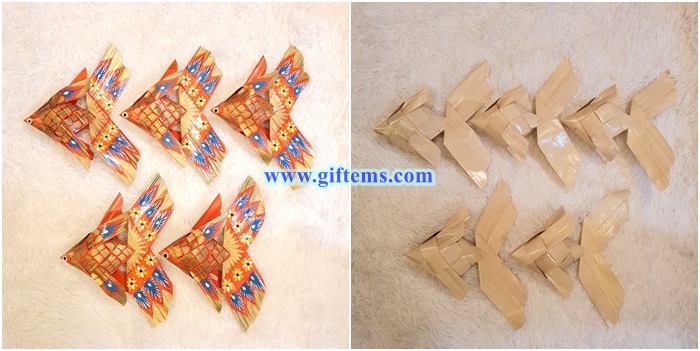 "Plain weave palm leaves" We make with beautiful chubby fish. Looks easy to make them but hardly for equal fish and beautiful fish but we can. Thank you for the order.